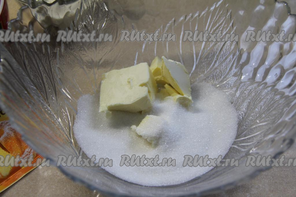 В миску, в которой будете замешивать песочное тесто, выложить мягкое сливочное масло, всыпать 50 грамм сахара.