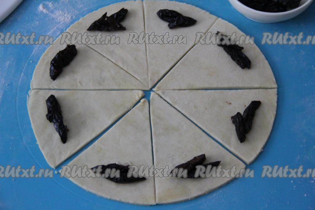 Чернослив нарезать на кусочки. Ближе к основанию каждого сегмента, немного отступив от краёв, выложить несколько кусочков нарезанного чернослива.