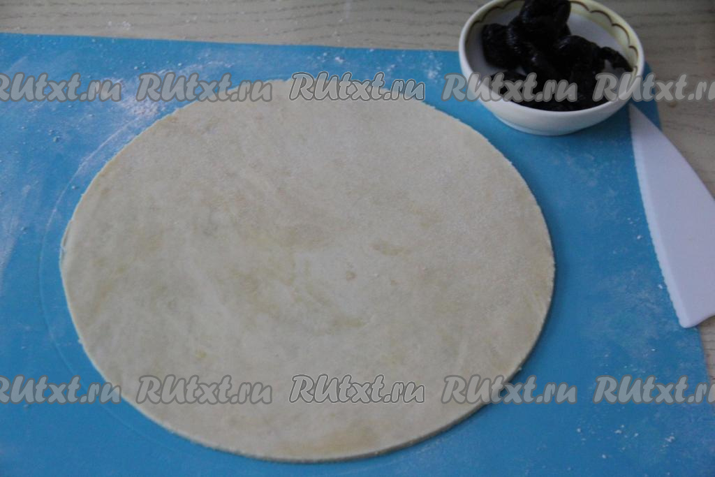 Для того чтобы края теста были ровными, я поверх раскатанного теста приложила тарелку и лишнее тесто обрезала ножом по краю тарелки.