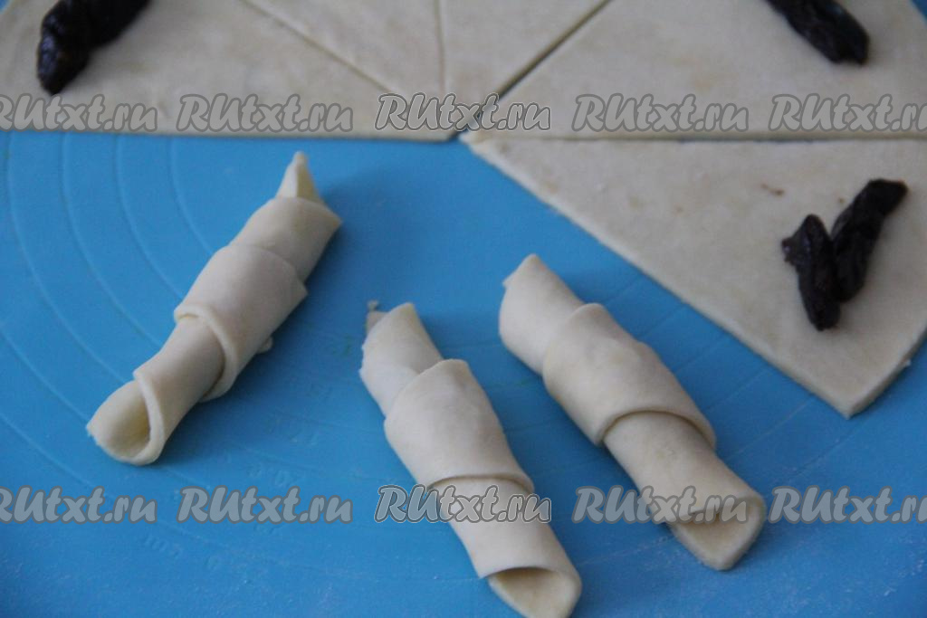 Свернуть тесто в плотный рогалик, начиная со стороны с черносливом.