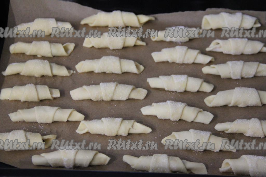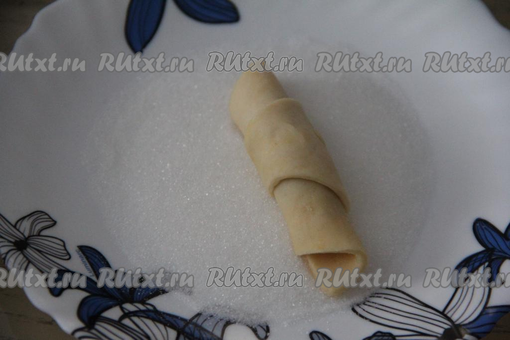 На достаточно плоскую тарелку насыпать грамм 50 сахара. Обвалять рогалики в сахаре со всех сторон.