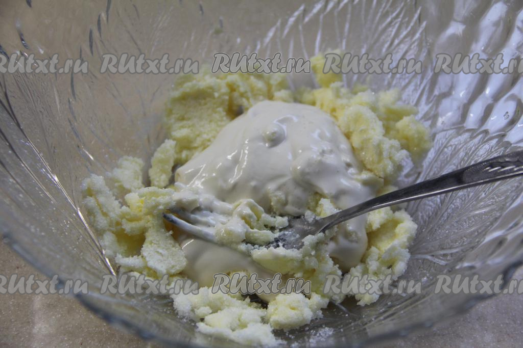 В получившуюся массу выложить сметану, перемешать вилкой.
