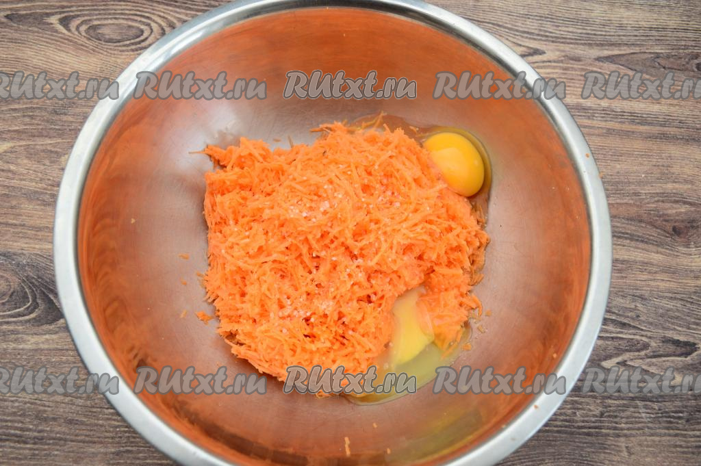 В миску с натёртым бататом вбить яйца, посолить по вкусу.