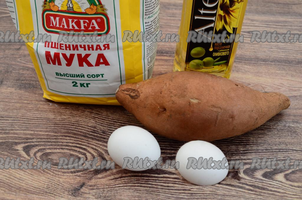 Подготовить продукты. Батат у меня был крупный, вес одного корнеплода составил 450 грамм.
