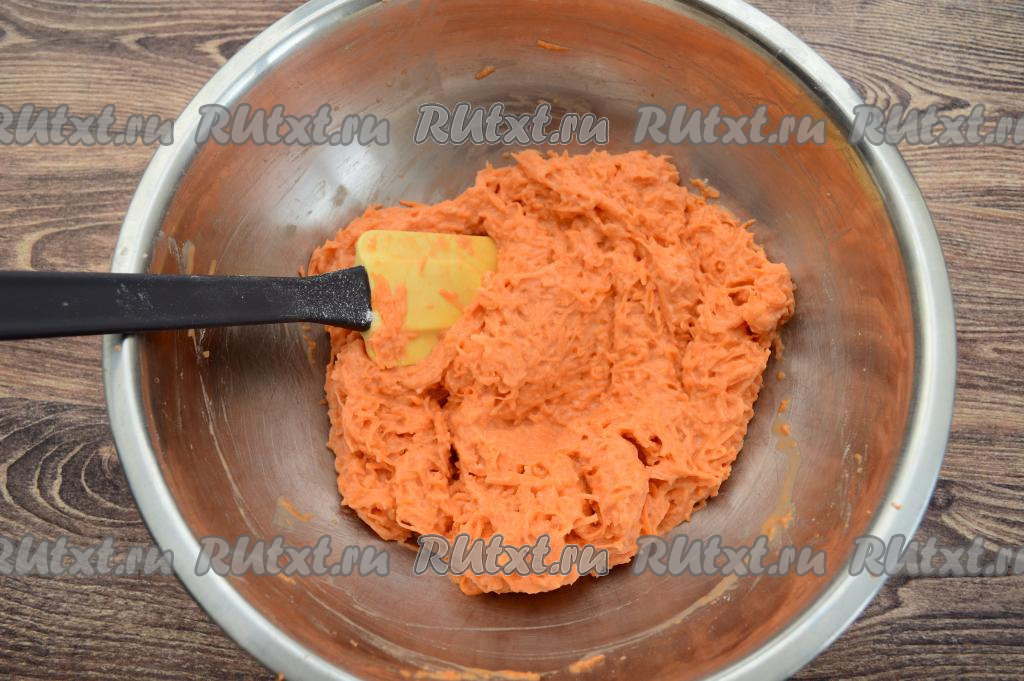 Смешать натёртый батат с яйцами и солью до получения однородной массы.