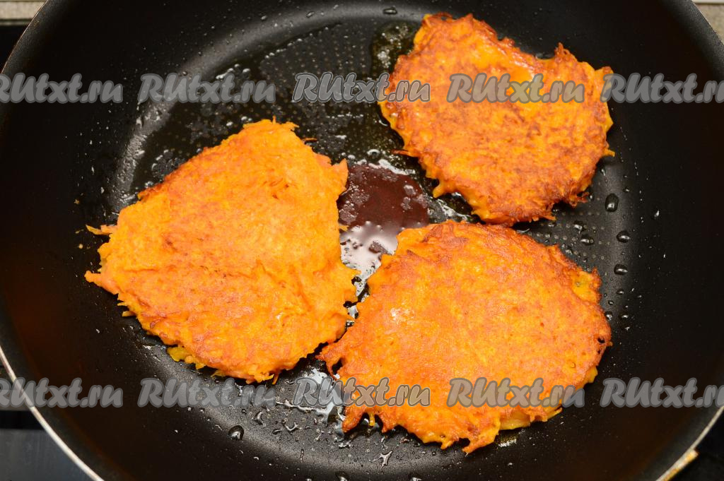 В сковороду влить растительное масло, хорошо его разогреть. Затем выкладывать в сковороду по 1 столовой ложке теста, формируя достаточно плоские драники из батата.