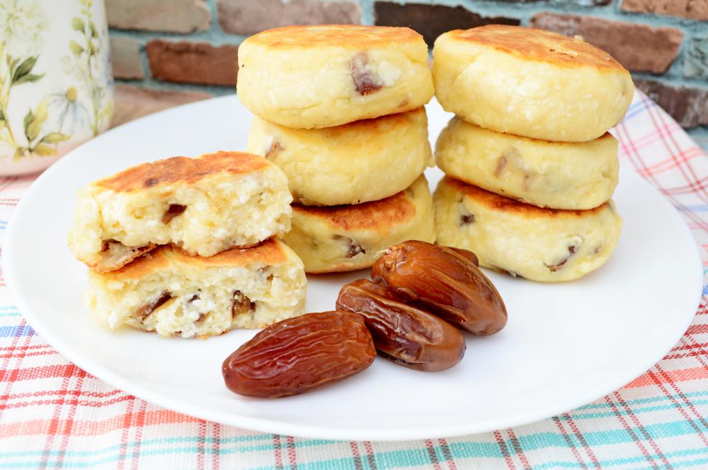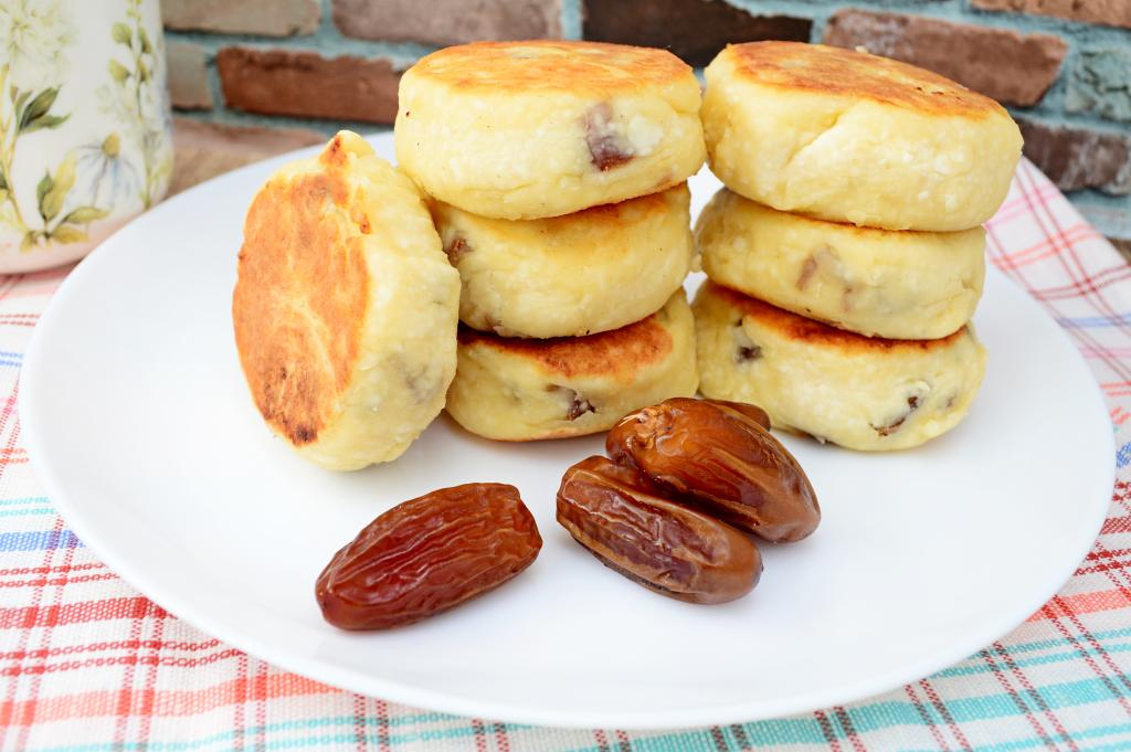 Вкуснейшие, пышные сырники с финиками можно есть и тёплыми, и остывшими.