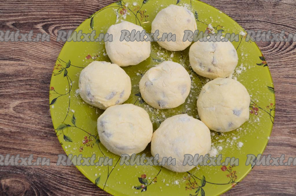 Зрительно разделить получившееся творожное тесто с финиками на 8 равных частей. Руками, слегка смоченными водой, из каждой части теста сформировать круглый сырник. На тарелку насыпать 1,5 столовых ложки муки, обвалять сформированный сырник со всех сторон в муке.