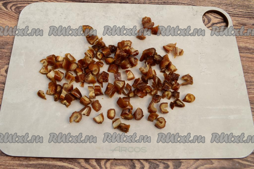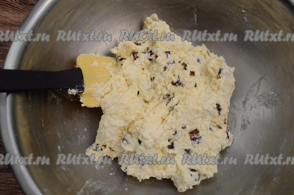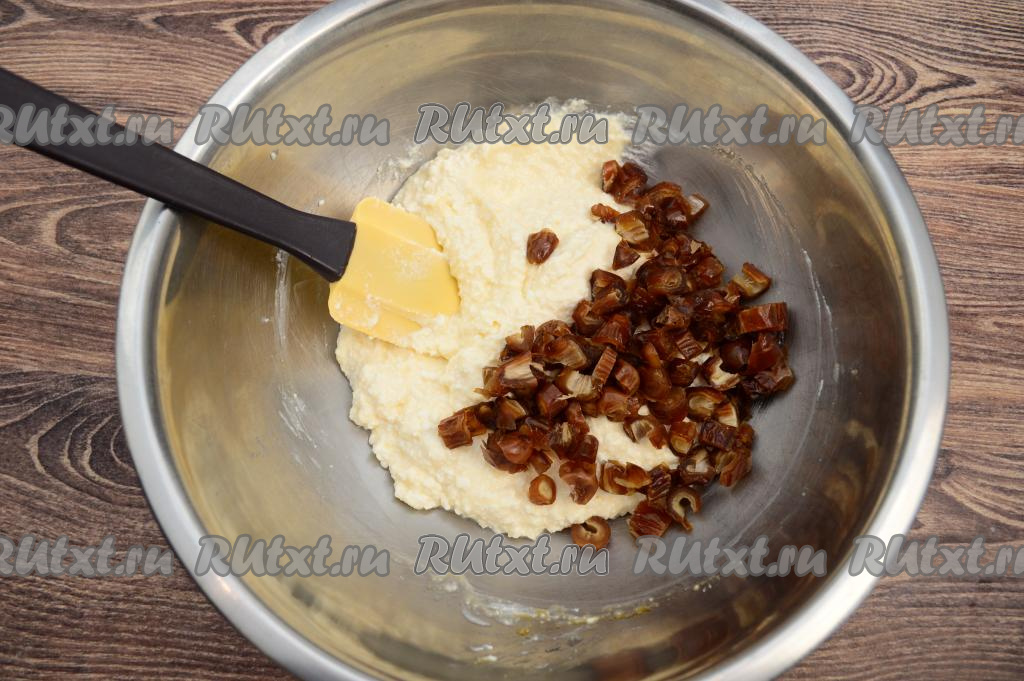 Добавить нарезанные финики в миску с однородной творожной массой.