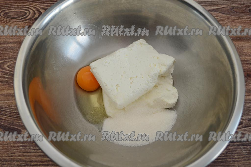 В глубокую миску выложить творог, сырое яйцо и сахар.