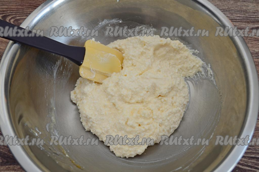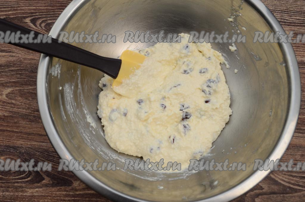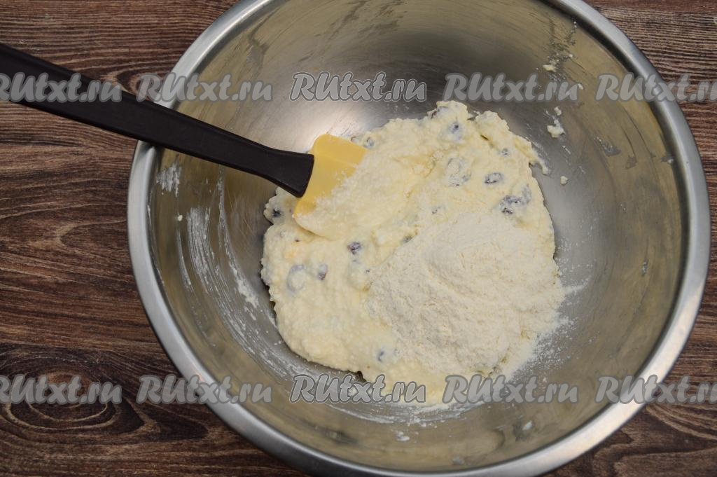 Затем всыпать грамм 40 муки, вмешать в творожную массу.