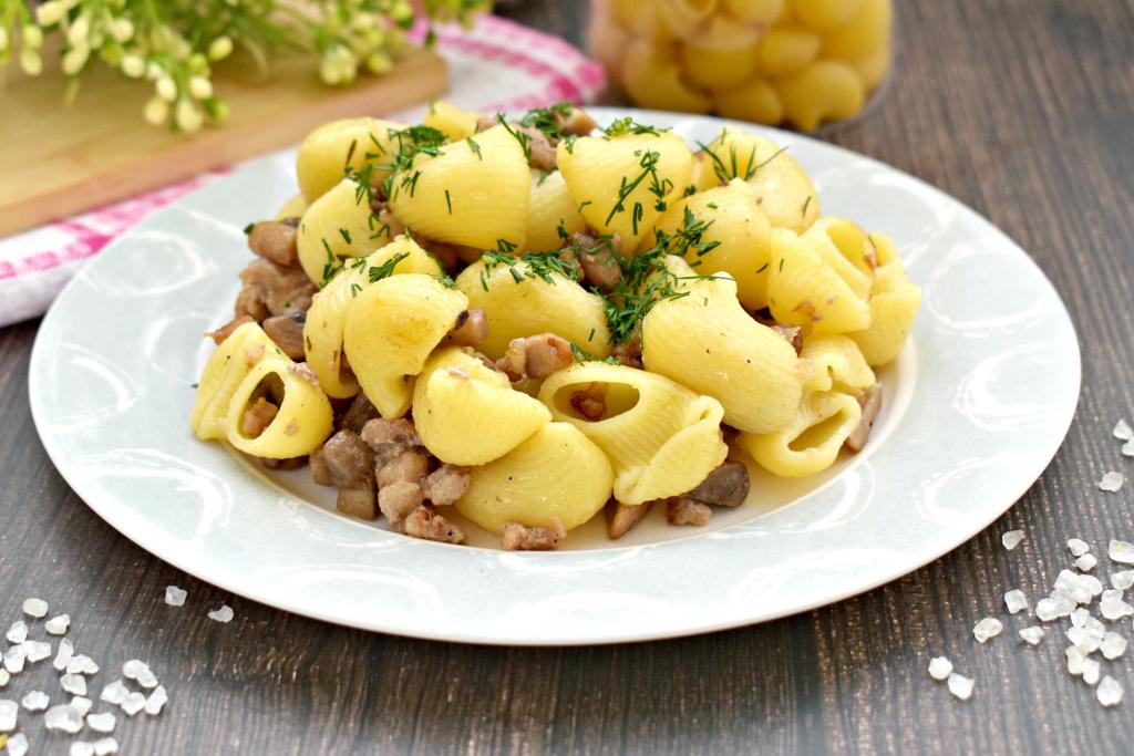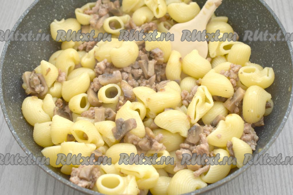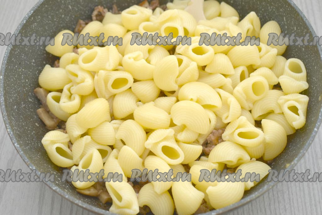 Макароны, отваренные до готовности, откидываем на дуршлаг, оставляем на несколько минут, чтобы слилась вся вода. После того как фарш обжарится с грибами в течение 10-15 минут, выкладываем в сковороду отваренные макароны.