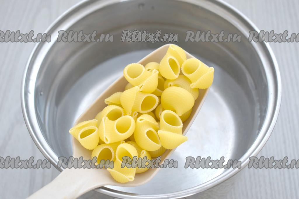 В кастрюле доводим до кипения достаточно большое количество подсоленной воды, затем выкладываем макароны любой формы, даём воде закипеть, перемешиваем, убавляем огонь и варим макаронные изделия до готовности (точное время варки нужно смотреть на упаковке макарон, которые вы отвариваете, я варила 8 минут).