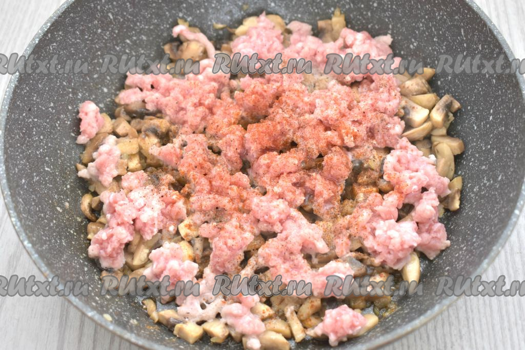 К грибам, обжаренным с луком, добавляем мясной фарш, по вкусу солим, приправляем специями (в качестве специй я добавила паприку и чёрный молотый перец), перемешиваем.
