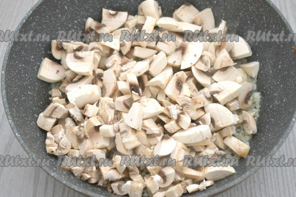 Для этого блюда можно взять предварительно отваренные в течение 30 минут лесные грибы, либо свежие (или замороженные) шампиньоны. Шампиньоны предварительно отваривать не нужно, их достаточно промыть водой, немного обсушить, нарезать на небольшие кубики. К луку, обжаренному до мягкости, выкладываем нарезанные шампиньоны (или предварительно отваренные и нарезанные на части лесные грибы), перемешиваем, обжариваем 5-6 минут, периодически перемешивая.