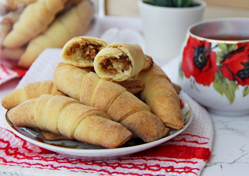 Бакинские мутаки с начинкой из грецких орехов получаются аппетитными, рассыпчатыми и очень вкусными. На фото видно, как выглядит в разломе этот рогалик с орехами.