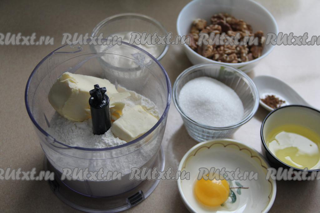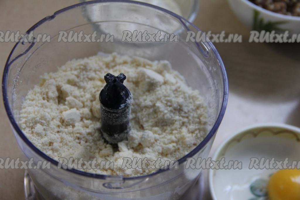 В измельчителе (или руками в миске) перемешать муку с маслом до получения мелкой масляно-мучной крошки.