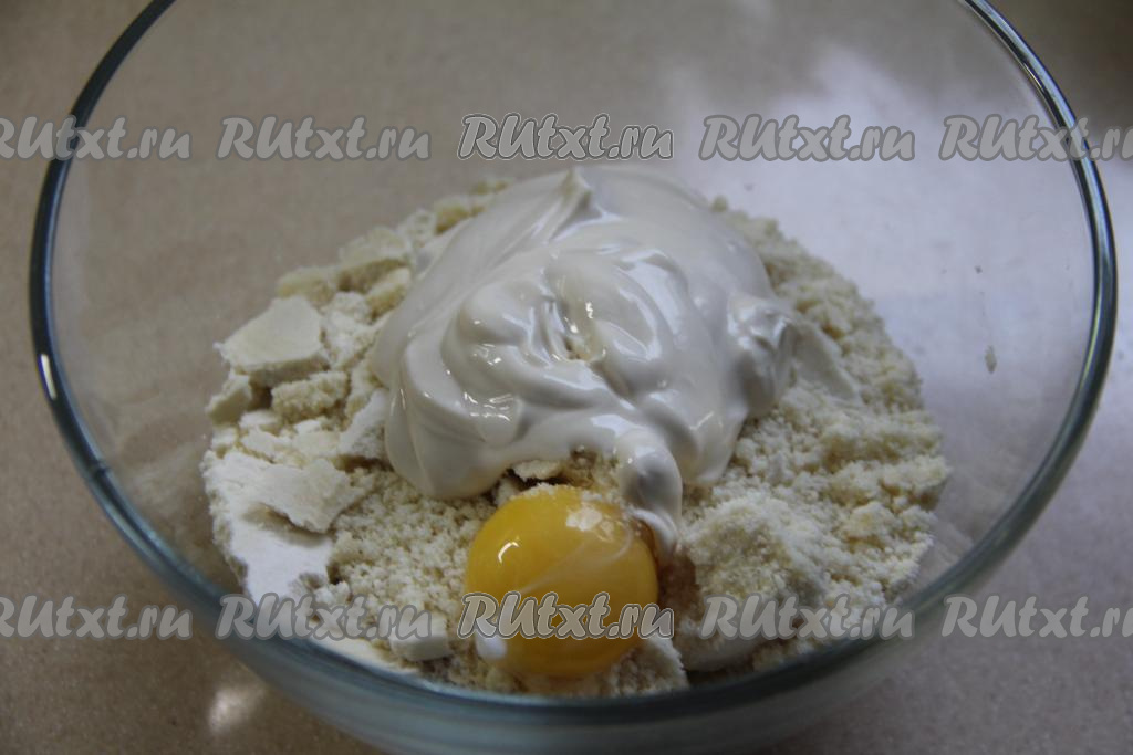 Если перемешивали муку с маслом в измельчителе, тогда переложить получившуюся масляно-мучную крошку в миску. В миску с крошкой добавить сырой яичный желток и сметану.