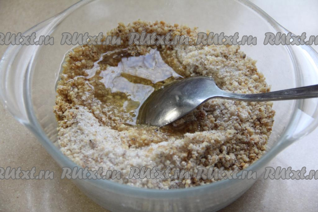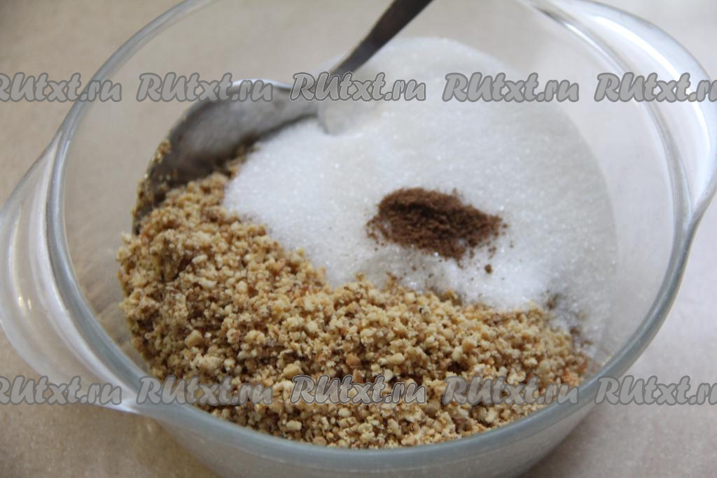 Пока песочное тесто охлаждается, займёмся начинкой. Очищенные грецкие орехи измельчить до получения крошки (я измельчала в измельчителе). Измельчённые орехи всыпать в миску, добавить сахар и кардамон, тщательно перемешать ореховую массу столовой ложкой.