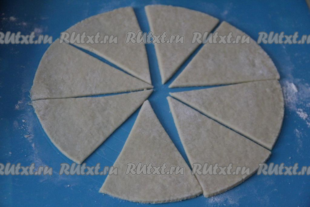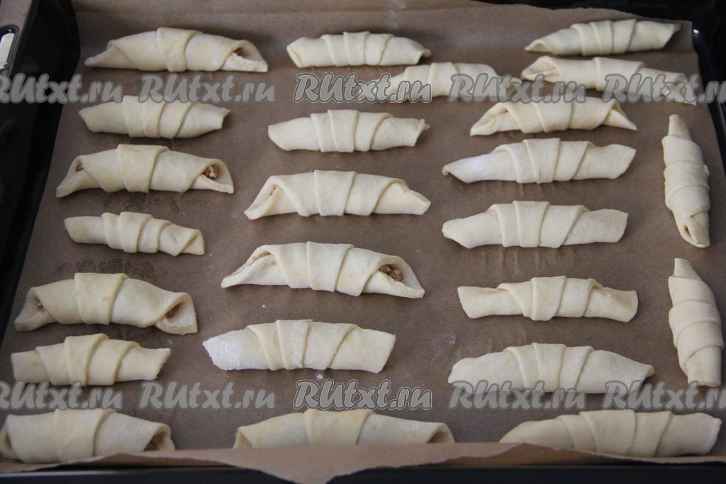 Немного отступив от края каждого сегмента, выложить по 1 чайной ложке ореховой начинки. Начиная со стороны с орехами, свернуть тесто в рогалик.