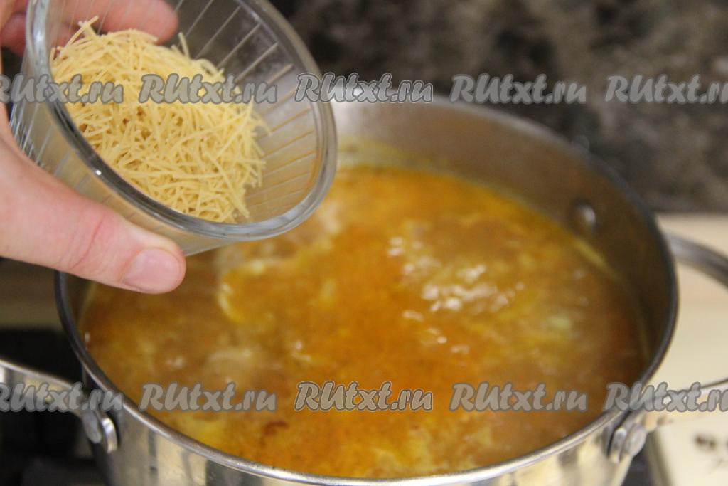 Аппетитный, вкусный, насыщенный сливочный суп, сваренный с курицей и вермишелью, разлить по тарелкам и горячим подать к столу.