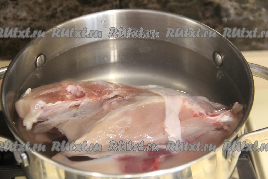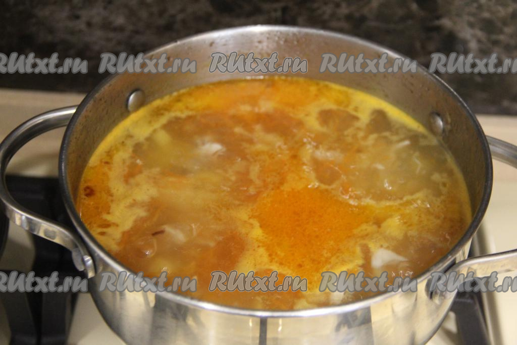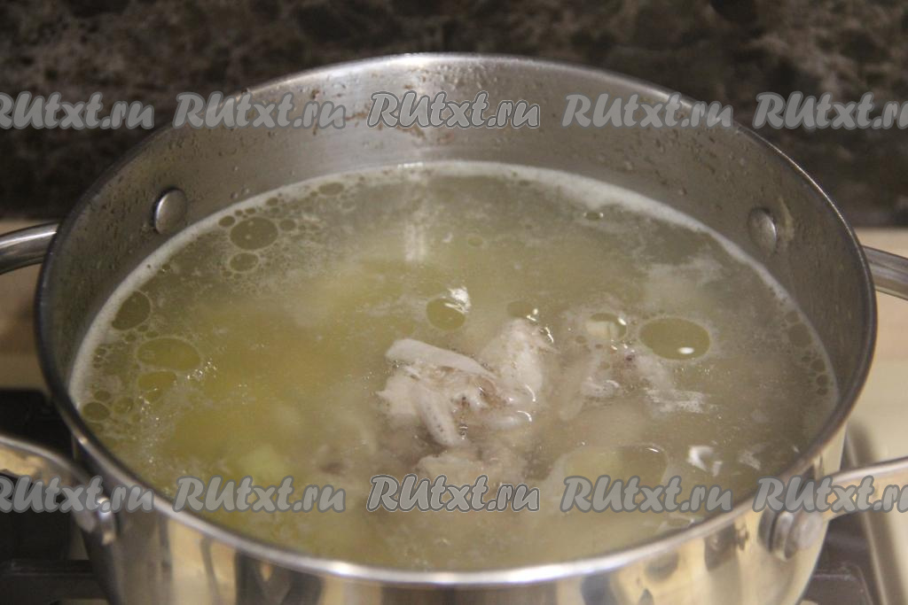 Сразу же добавить в кастрюлю кусочки куриного мяса, дать бульону закипеть, варить на небольшом огне 15 минут.
