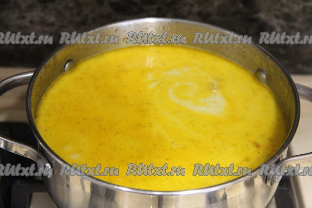 Добавить соль по вкусу, влить сливки. Довести сливочный суп с курицей и вермишелью до кипения.