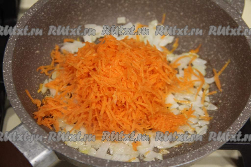 Пока картошка варится, займёмся обжариваем морковки с луком. Для этого нужно разогреть растительное масло в сковороде, выложить мелко нарезанный лук, обжарить его на среднем огне в течение 3-4 минут (лук должен стать прозрачным), затем выложить морковку, натёртую на мелкой тёрке, перемешать. Обжаривать минут 5 (морковка должна стать мягкой), иногда помешивая. Обжаренные овощи убрать с огня.