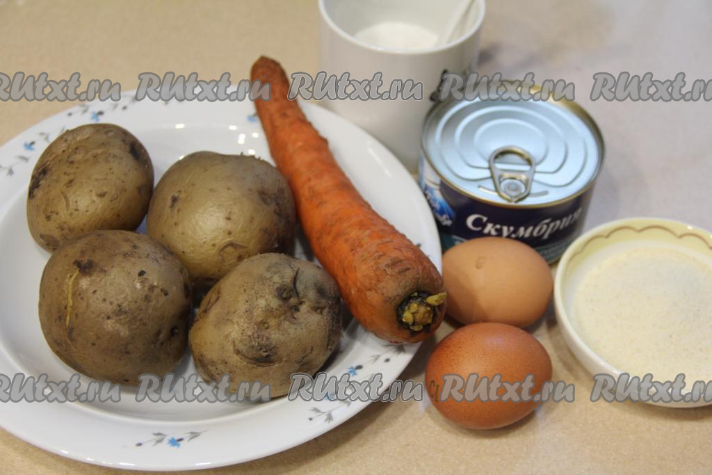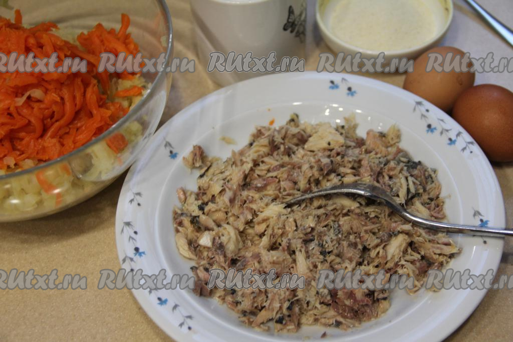Натереть на крупной тёрке картошку и морковь в глубокую миску. С консервированной рыбы слить лишнюю жидкость. Выложить рыбку на тарелку, удалить крупные кости, затем размять рыбу вилкой.