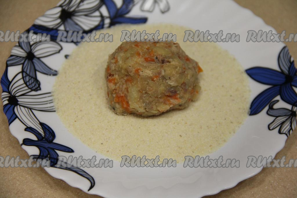Затем всыпать манку, ещё раз перемешать получившийся фарш. Оставить фарш постоять при комнатной температуре минут на 15, чтобы манка немного набухла. Фарш станет ещё более плотным, из него можно будет достаточно легко сформировать котлеты.