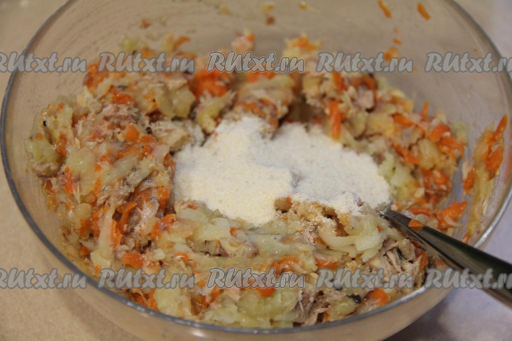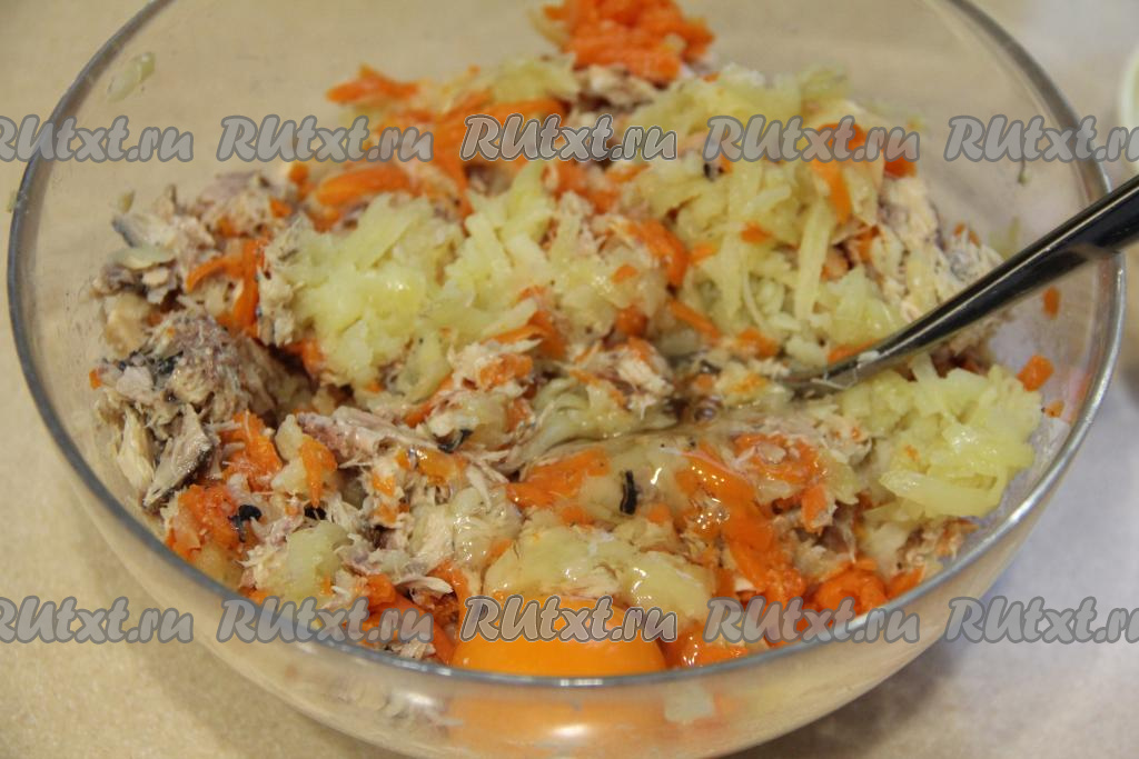 В миску с натёртыми морковью и картошкой добавить размятые рыбные консервы, посолить, поперчить по вкусу.