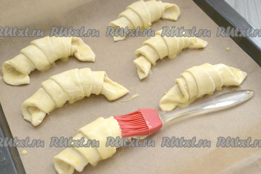 Выкладываем слоёные рогалики с повидлом на противень, застеленный пергаментом. В небольшой миске взбиваем сырой яичный желток с 1 столовой ложкой молока до однородности. Получившейся смесью из молока и желтка смазываем рогалики.