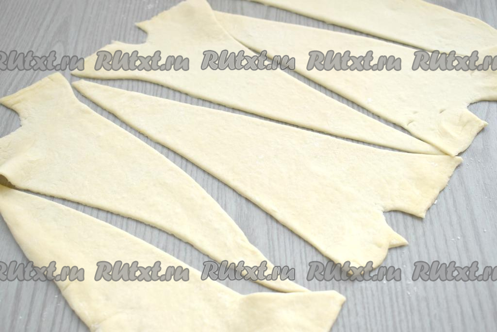 Раскатанное тесто разрезаем на 3 равных прямоугольника. Затем каждый прямоугольник разрезаем по диагонали на треугольники. В итоге у нас должно получиться 6 треугольников. У основания каждого треугольника делаем по середине надрез глубиной примерно с 1 сантиметр. Углы треугольника у основания немного разводим в стороны.