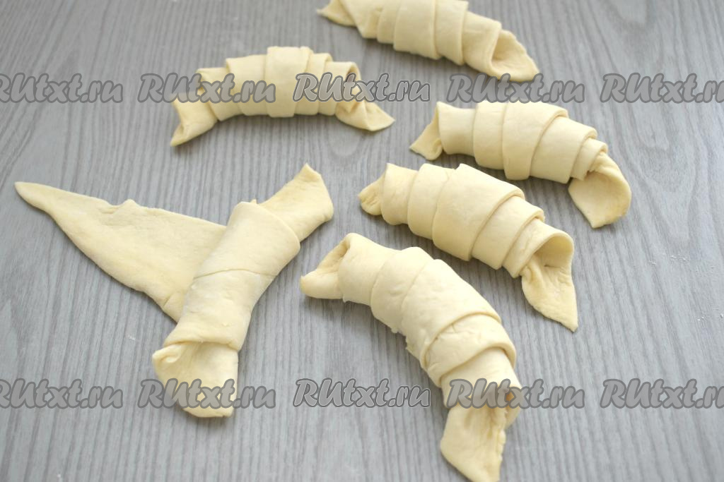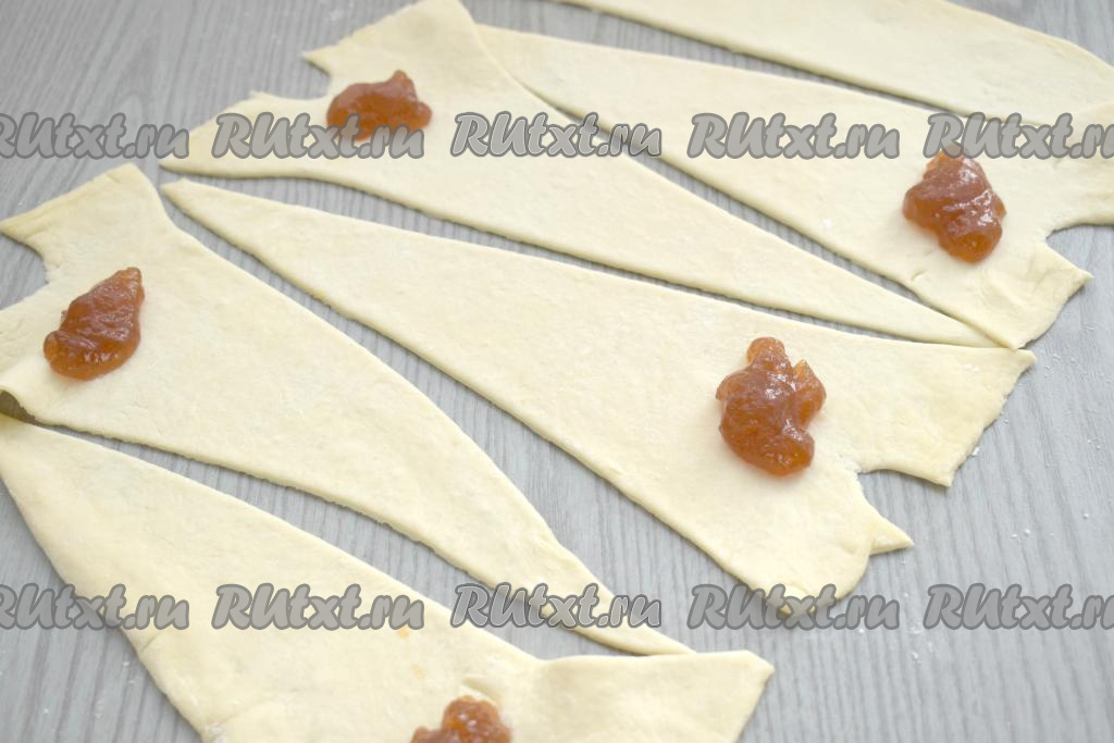 Каждый треугольник, начиная со стороны с повидлом, сворачиваем в рогалик.