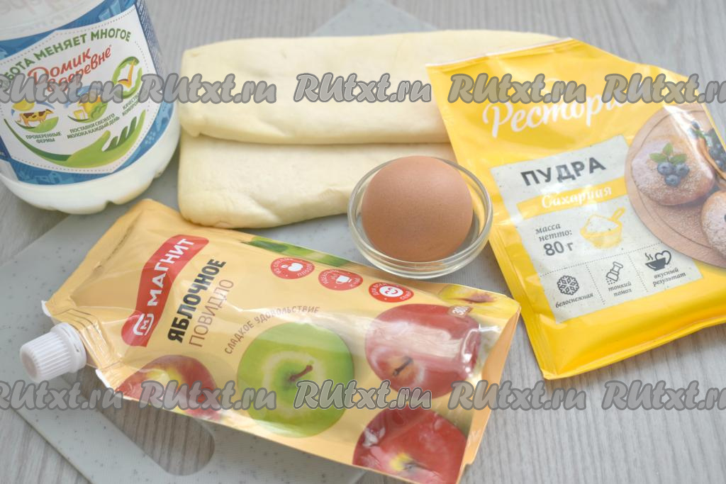 Подготовить продукты. Слоёное тесто можно взять как дрожжевое, так и бездрожжевое (у меня - дрожжевое). Повидло я взяла яблочное, но подойдёт любое другое фруктовое или ягодное. Тесто размораживаем заранее при комнатной температуре.