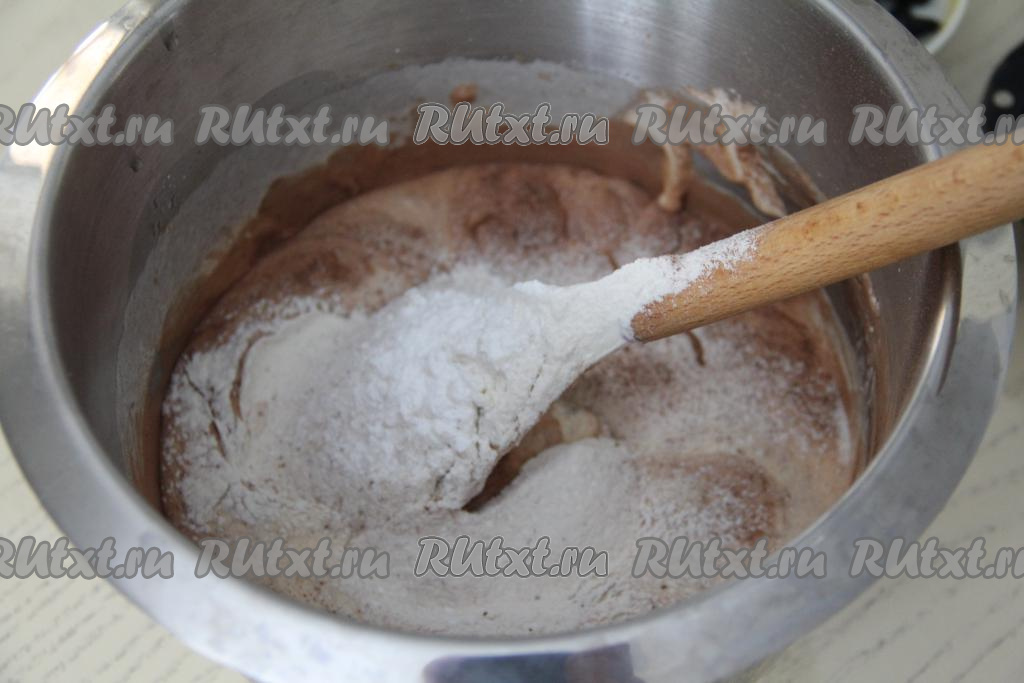 Отдельно просеять муку. В смесь яиц и какао всыпать треть муки и весь разрыхлитель. Аккуратными, но уверенными движениями лопатки, вмешать муку и разрыхлитель. Затем частями подсыпать оставшуюся муку, каждый раз полностью вмешивая её, стараясь не сбить воздушность бисквитного теста.