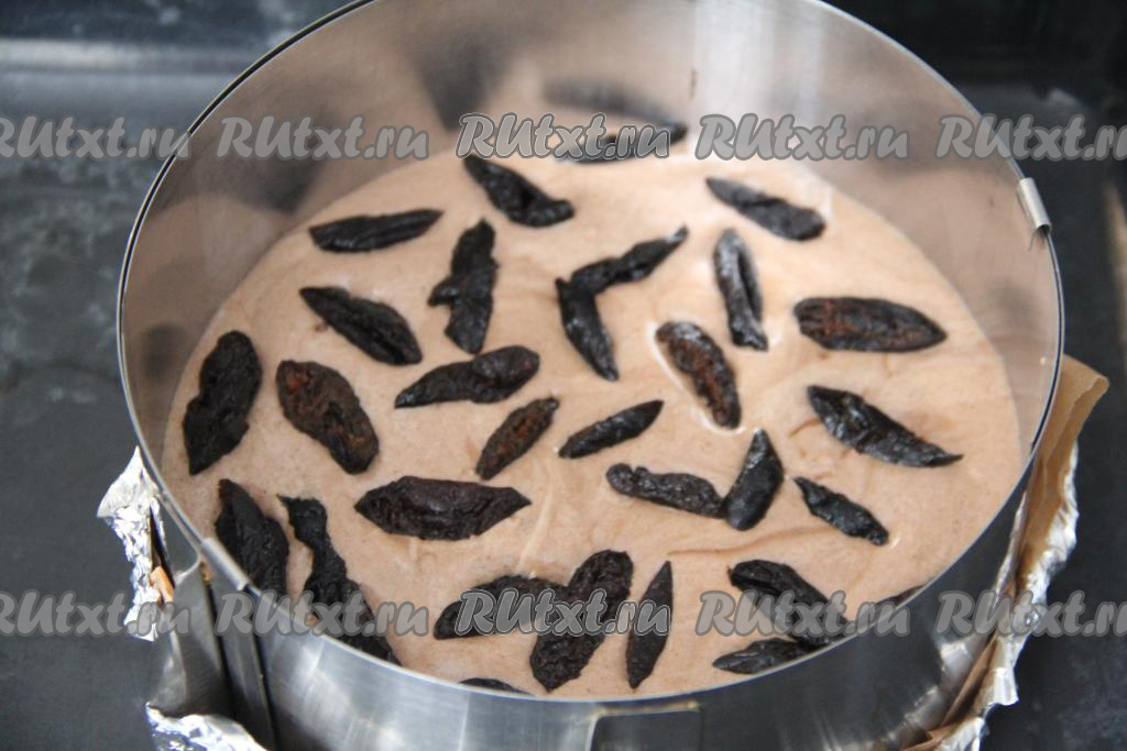 Нарезать чернослив на продолговатые кусочки. Выложить кусочки чернослива поверх бисквитного теста, немного утапливая их в тесто.