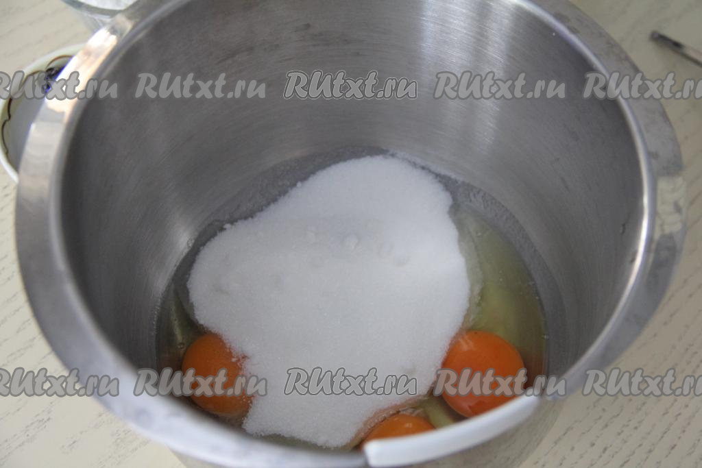 В чашу миксера вбить яйца, всыпать сахар.