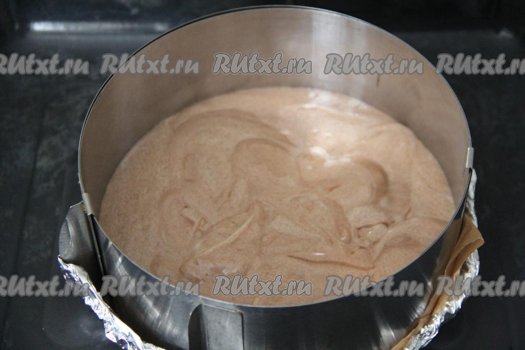 Разъёмную форму для выпечки диаметром 20 сантиметров застелить пергаментом, смазать бока формы растительным маслом. Вылить в форму бисквитное тесто.