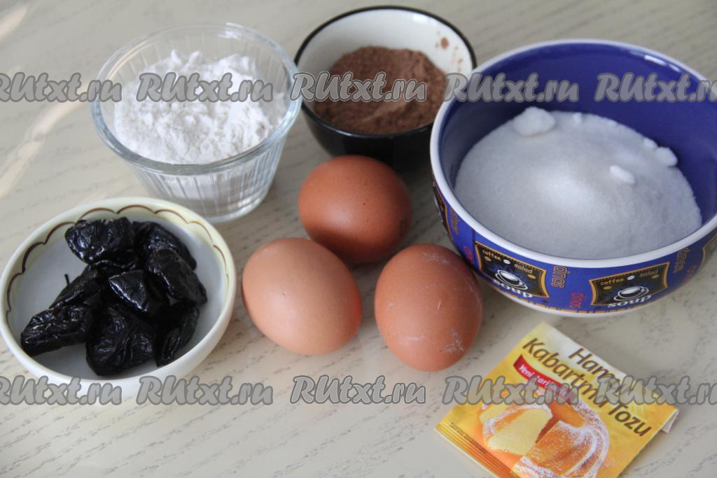 Подготовить продукты для приготовления бисквита. Чернослив заранее обдать кипятком, потом обсушить, выложив на бумажные полотенца.
