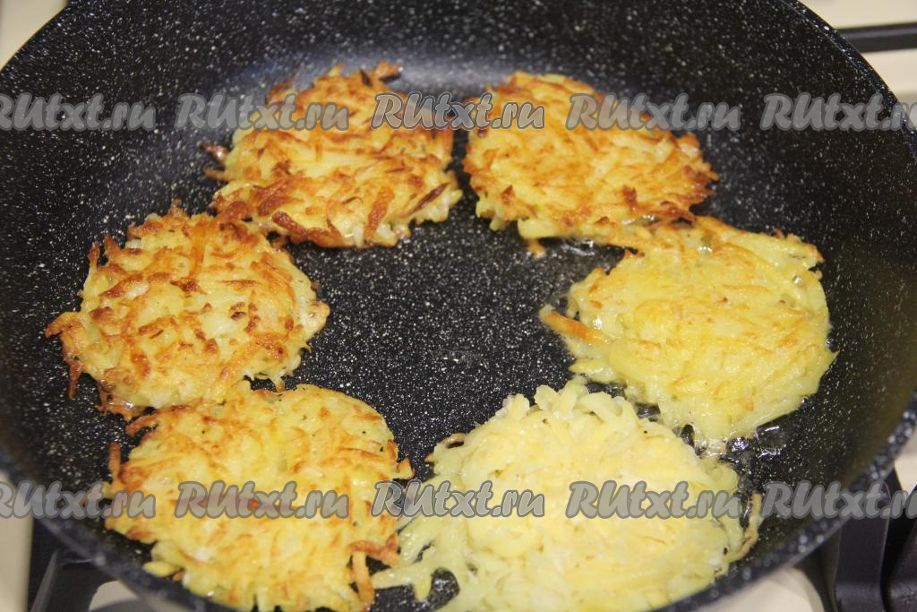 Жарить картофельные драники на среднем огне с двух сторон до золотистого цвета. Драники снаружи должны покрыться хрустящей корочкой снаружи и при этом стать достаточно мягкими внутри. Готовые драники переложить на тарелку. Постепенно пожарить все драники.