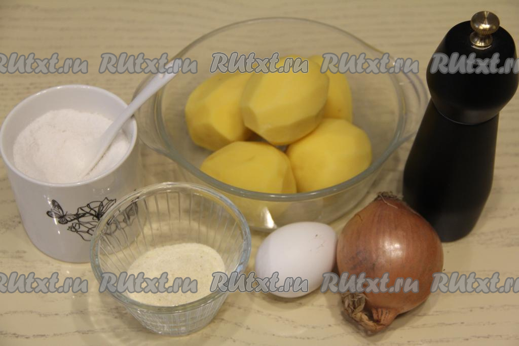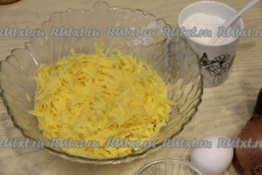Картошку натереть на крупной тёрке. Беря понемногу в руки картофельную массу, отжать из неё лишний сок.