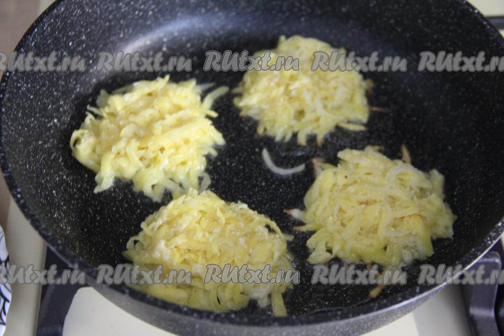 Разогреть сковороду с растительным маслом. Выкладывать по 1 столовой ложке картофельной массы в виде круглых оладий.