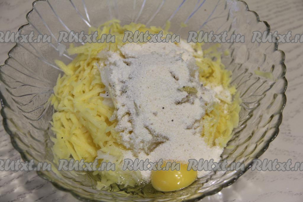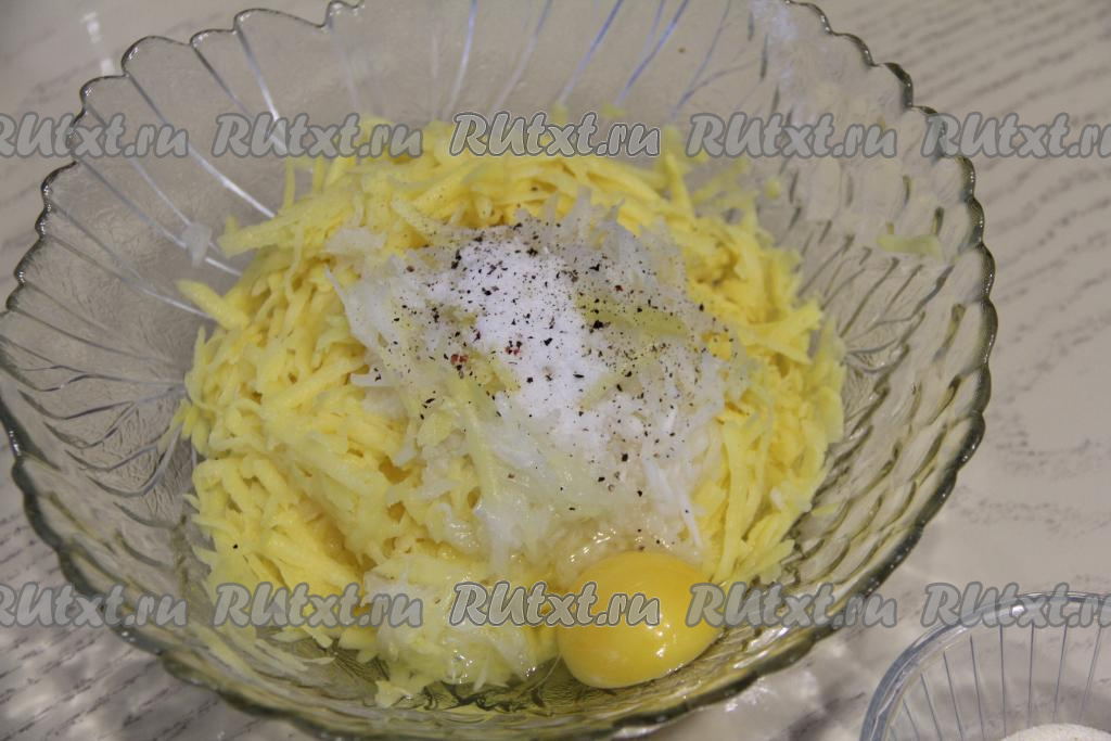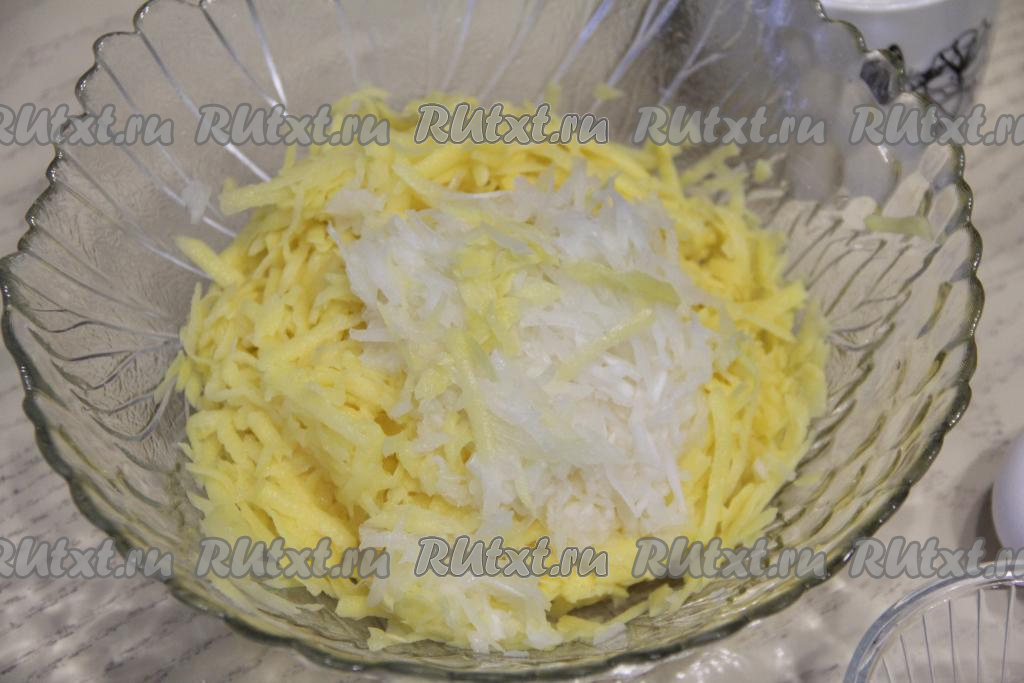 В миску с картофельной массой, отжатой от лишнего сока, добавить лук, натёртый на крупной тёрке.