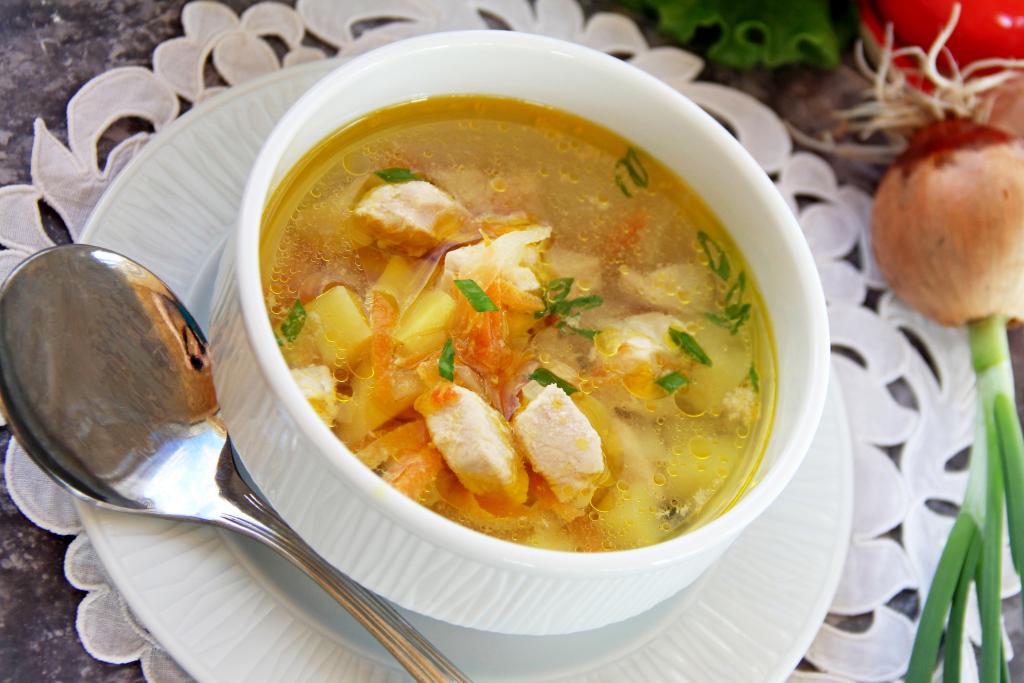 Подготовить продукты. Картошку, лук и морковь почистить. Картошку выложить в достаточно глубокую ёмкость, полностью залить водой, чтобы она не потемнела. Куриное филе промыть водой.