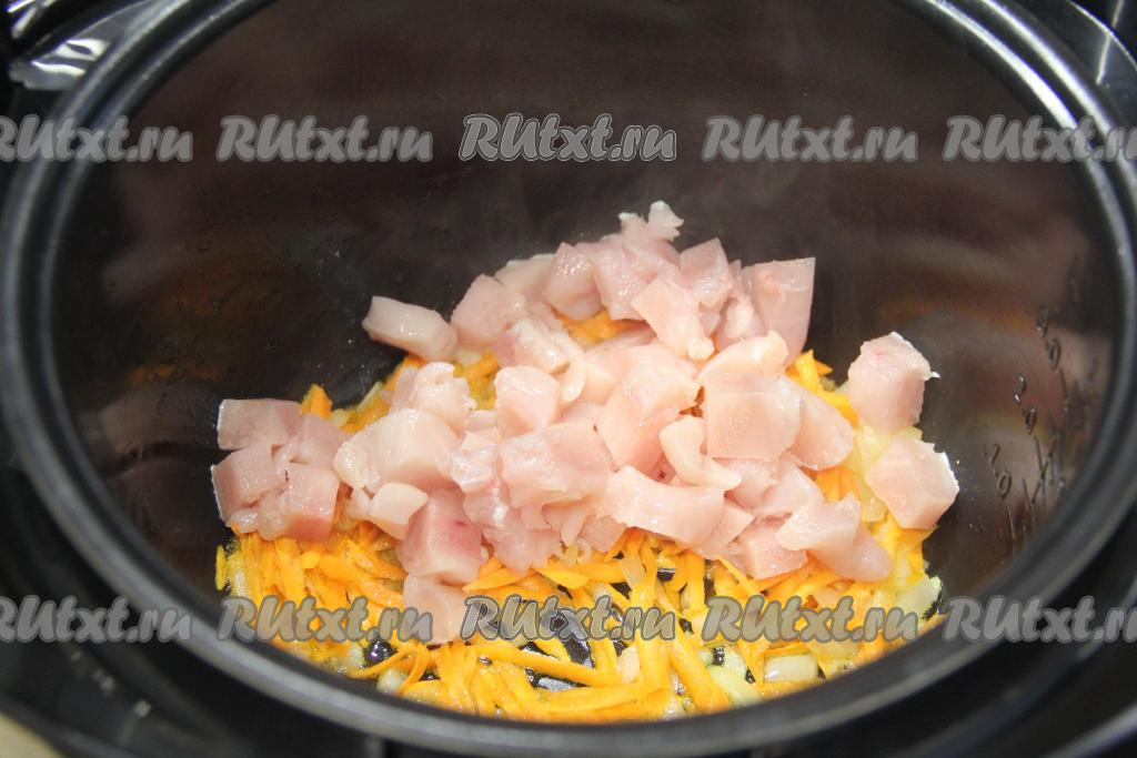Куриное филе нарезать на небольшие кубики, добавить к обжаренным овощам в чашу мультиварки, перемешать.