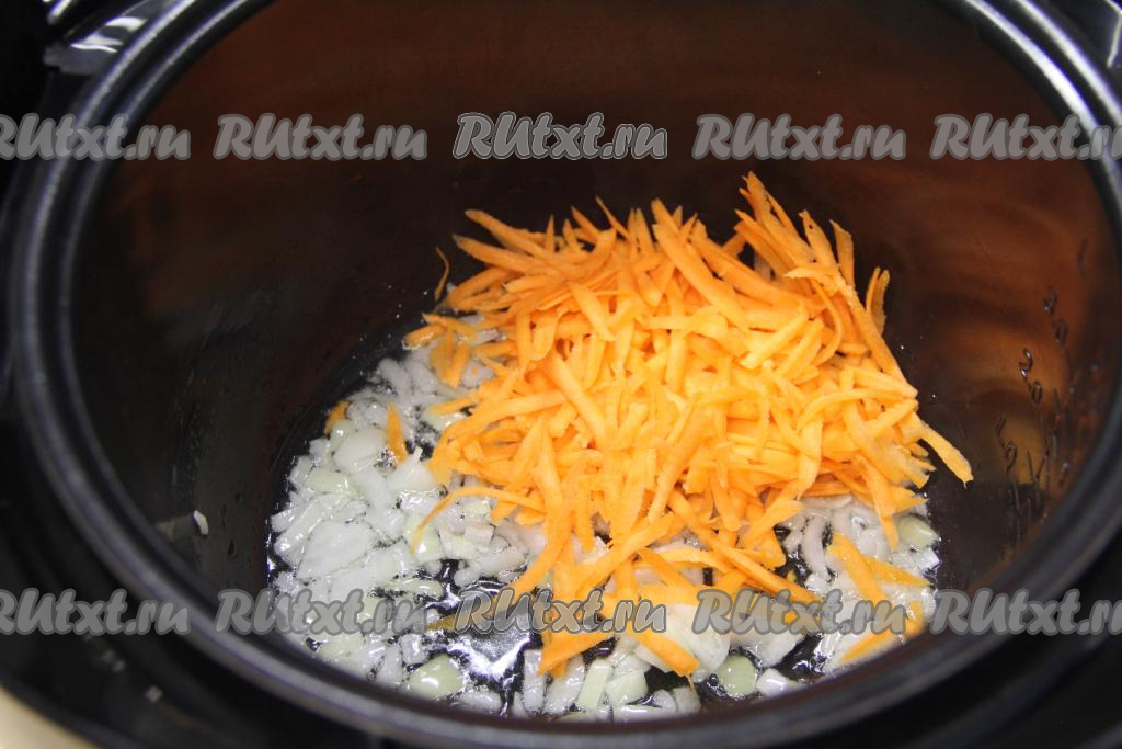 К обжаренному луку выложить морковку, натёртую на крупной тёрке, перемешать, обжаривать минут 5 (до мягкости моркови), иногда перемешивая овощи в чаше мультиварке.