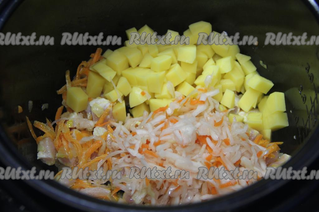 Затем в чашу мультиварки добавить картошку, нарезанную на средние кубики, и квашеную капусту.