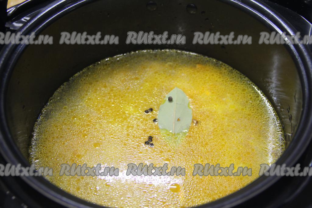 Влить 1,5 литра воды, добавить соль (всыпая соль, не забывайте учитывать степень солёности квашеной капусты, которую вы используете), лавровый лист и специи по вкусу. Выставить режим "Суп" на 1 час, закрыть крышку мультиварки.