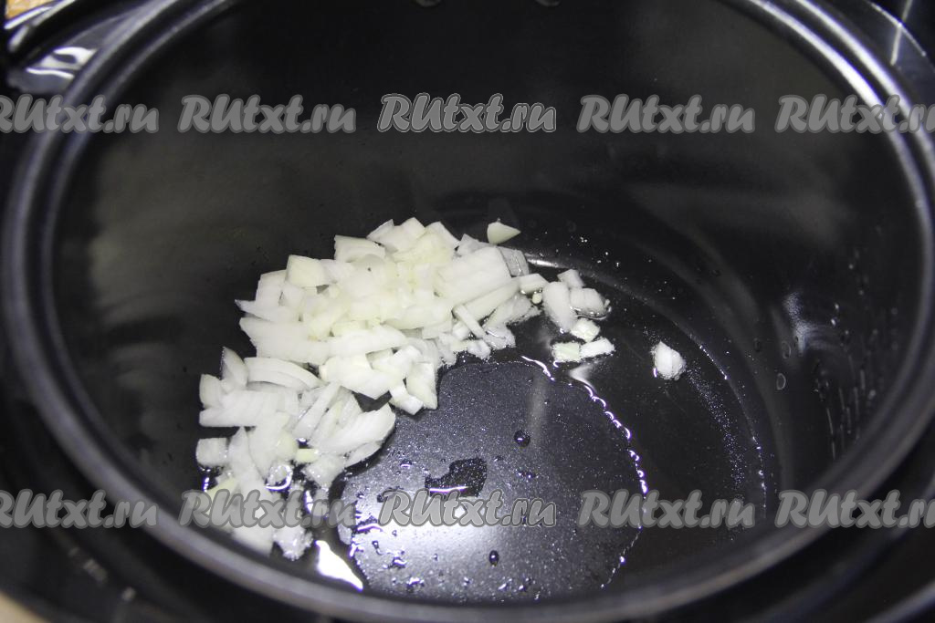 В чашу мультиварки влить растительное масло, выставить режим "Жарка". Выложить в чашу мелко нарезанный лук, обжарить его до прозрачности (в течение 4-5 минут), иногда помешивая.